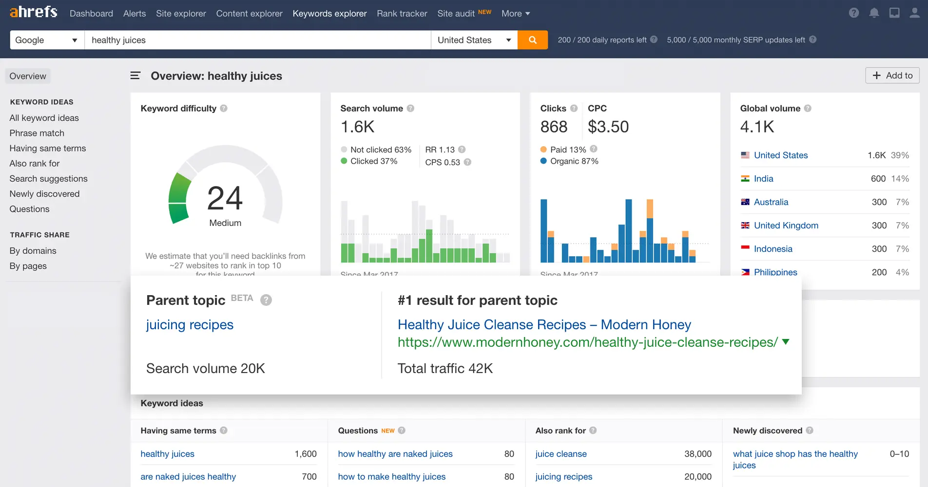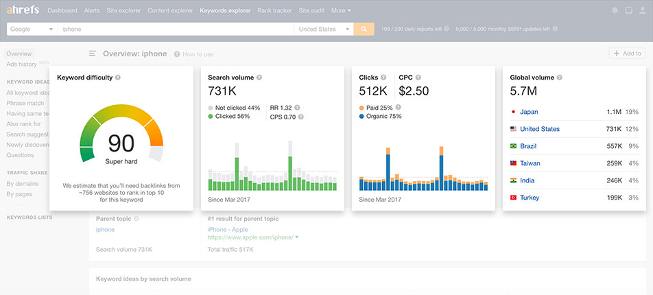 8 milyondan fazla sorguyu veritabanında barındırdığını belirten Ahrefs, girebileceğiniz anahtar kelime veya long tail anahtar kelimeden en fazla aranan 100 ilgili anahtar kelime önerisi paylaşıyor.