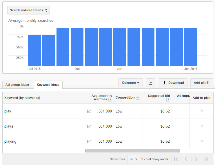 Diğer bir örneğe geçelim. “Play” kelimesini ele alırsak Google’ın mantığına göre “plays” ya da “playing” kelimelerini bu kelime ile birleştirmek gerekmektedir. Bu birleştirmenin sonucunda bu üç kelime aynı aranma oranlarına ve aynı fiyatsal değerlere sahip olarak gözükmektedir.