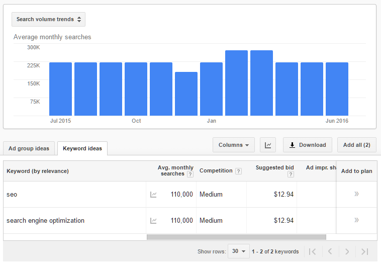 Yukarıda gördüğünüz üzere Google’ın anahtar kelime planlayıcısı, “SEO” ile “Search Engine Optimization” kelimelerinin aylık ortalama olarak aynı aranma istatistiğine sahip olduğunu söyleyip kullanıcıları iki kelimenin de fiyatsal olarak aynı olduğuna dair yönlendirme yapıyor. Daha kötüsü, Google bu kelimeleri ses tahminlerine bağlı olarak grupluyor ancak size rapor grafiğini oluştururken grupladığı kelimeleri ayırmıyor ve onları tek bir noktada birleştiriyor. Bu da yukarıda gördüğünüz görsele bağlı olarak sizi bu iki kelimeye de reklam verirseniz, ayda 200 binden fazla gösterim elde edersiniz şeklinde bir sonuca ulaştırıyor(Google’ın size sunduğu grafik verilerine göre). Eğer Moz Keyword Explorer’ı kullanırsanız doğru verilerle ve doğru oranlarla iş yapacaksınız.